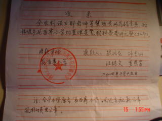 敬愛的談老師; 您好! 在上次的電話中,好像談到您的腿不舒服並到醫院拍片檢查,不知診斷如何?有大礙嗎 小沙和我都很擔心,您千萬要保重! 您給合寧小學寄來的一千元加幣的匯票及寄給沙氏兄妹等的二百元匯票早已收到,非常的謝謝!我們深深的體會到您寄給我們的不僅僅是錢,還有一顆關心教育事業,關心下一代成長的 眷念故國,眷念故鄉的老人的心;但由於工作特忙,而未能及時的將收據等寄給您,真的非常抱歉,還請您老原諒 談老師!您一位年近古稀的老人,為我們的學校,為我們的孩子們四方求助,回想起來,我們的內心真的很不安!甚至於有些後悔給您添麻煩,害您去為我們奔波勞碌,真的很對不起!不過,您的行為,您的事蹟已深深的震撼了我們!我們的同事,學生和下一代,我們將永遠銘記您,會把您的事蹟作為傳家寶一代代地傳下去!讓我們的子孫後代都知道,當年,加拿大曾經有過這樣的一個老人! 談老師!咱們之間的橋樑和紐帶絕非是錢,是您的精神!品德和觀念!我們已經按您的建議發動了合寧小學的全體教師和部分學生組成了一支製作桌凳的, 雜牌軍小隊伍,經過一個多月的艱苦勞作,完成了計畫,達到了預期的目的,雖然做得不夠標準,但師生們都品嚐了勞動果實的香甜!